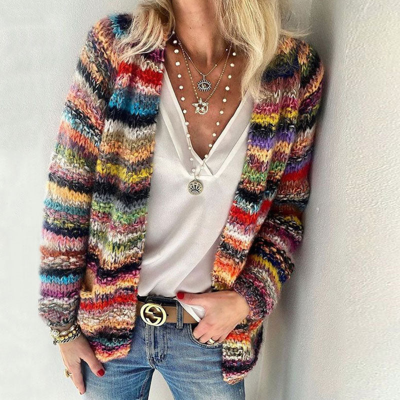 Warm up casual style with this vibrant and cozy striped knitwear. Crafted for comfort and fashion-forward flair. this oversized cardigan features a playful rainbow-striped pattern that adds a pop of color to your wardrobe. The open front design makes it perfect for layering. while the convenient patch pockets add functionality and style. Whether you're lounging at home or stepping out for a casual outing. this long knit jacket is your go-to choice for effortless chic. Stay warm. stay stylish. and embrace the rainbow with this must-have addition to your collection.