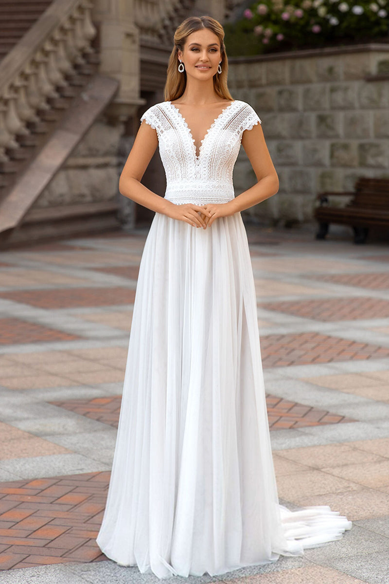 You'll have every heart beating faster when you walk out wearing the Love Devotion A-line White Wedding Dress! This gorgeous gown features an intricate lace design that forms the decolletage featuring a deep V-neckline and short cap sleeves with eyelash lace trim. High fitted waist falls to a chiffon maxi skirt that has sweep train. Open V-back with hidden zipper/clasp adds to the look.