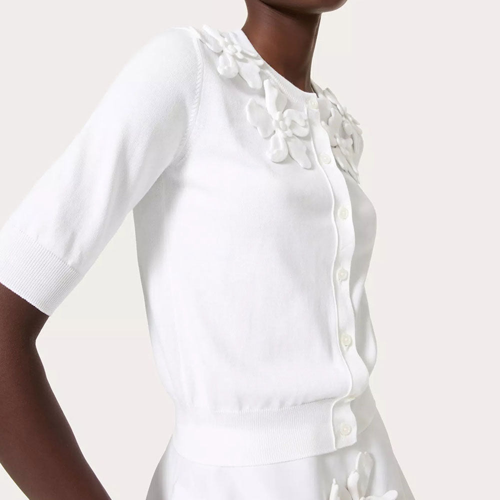 This fine cardigan. perfect for summer and fall. boasts a simple and minimalist design. with delicate rosette appliqué adorning a ribbed round neck. Short sleeves add just the right amount of flair to this quiet yet luxurious summer knit top. With center front buttons. you can style it with the buttons fully secured for a polished flower look or leave it unbuttoned for a relaxed. breezy feel. In a refreshing white color. this thin cardigan is highly versatile and can be worn on its own or as a layering piece in your wardrobe.