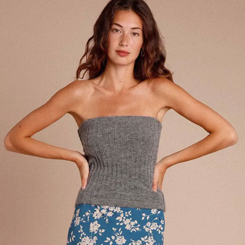 This is a bustier top in the 2000s dream. Available in timeless gray and black hues. the sleeveless top is a soft knit construction from a blend of wool and mohair-blend material for a comfortable touch. Textured in vertical ribs throughout. the high-stretch knit is finished with thick ribbed trims and unveils the shoulder. bringing a hint of breezy feel. Wear it solo that'll make you look undeniably hot. or style it with the coordinating knit cardigan for a day-to-night versatility. How easy would it be to make the combo for the office and then whip the outwear off for dinner or drinks at night.