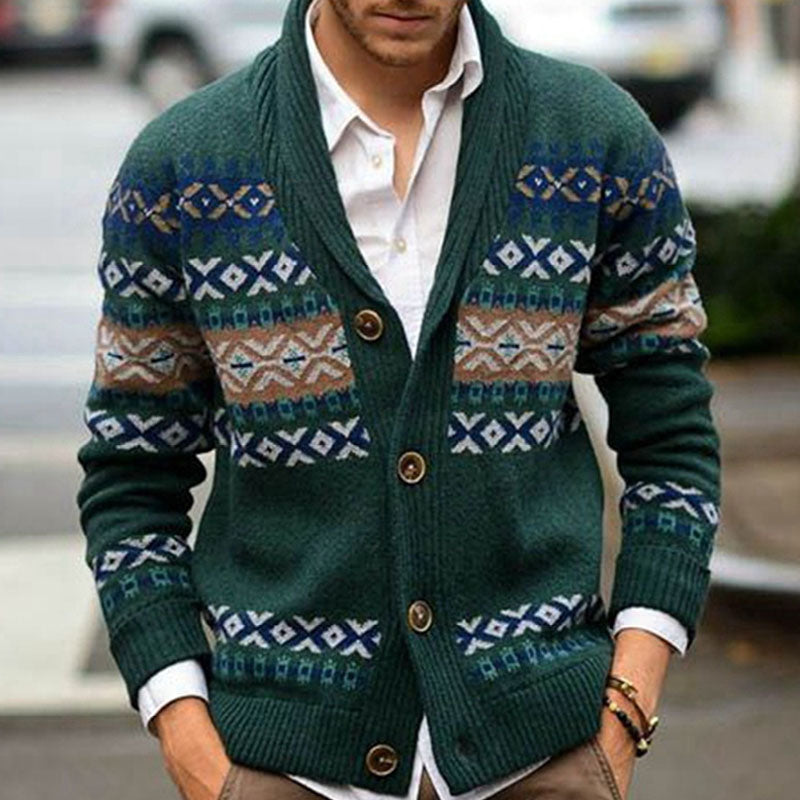 Donning this Nordic style knit jacket signals the start of men's winter fashion. Our fair isle knit cardigan. weighing 1.98 lbs. offers a regular fit. ideal for easy layering across autumn. winter. and early spring. Crafted with high-quality materials. this cardigan boasts intricate Fair Isle jacquard patterns and a shawl neck. epitomizing cozy sophistication. The rib-knit trim adds a touch of Nordic heritage. perfect for various occasions. Pair this winter essential with jeans or tailored pants for a chic yet relaxed look.