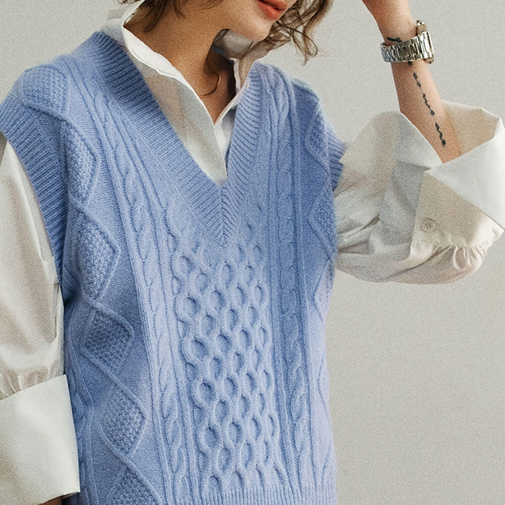 Let the smart look come into focus with this sophisticated knitted fisherman vest! This stylish piece features a timeless cable knit design. punctuated by ribbed V-neck. armhole and hem trim. Its semi-loose fit makes it a perfect layering piece—effortlessly complementing shirts or basic tops. Crafted from a blend of wool and acrylic. this sleeveless knitwear comes in white. beige. blue. and coffee to bring chic style to any layered look.