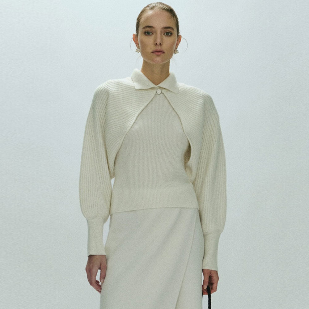 Classy and luxury chic define our two-piece wool blend knit set. an epitome of understated elegance and effortless sophistication. Available in Ivory and Gray. this knit set exudes quiet refinement with its ribbed knit. its knit tank top with a preppy style spread collar. paired elegantly with a bolero shrug cardigan. featuring a front split and metallic accent . Crafted from a sumptuous blend of 90% wool and 10% cashmere. it encapsulates comfort and opulence. making layering an effortless art and elevating your look with a touch of luxe.