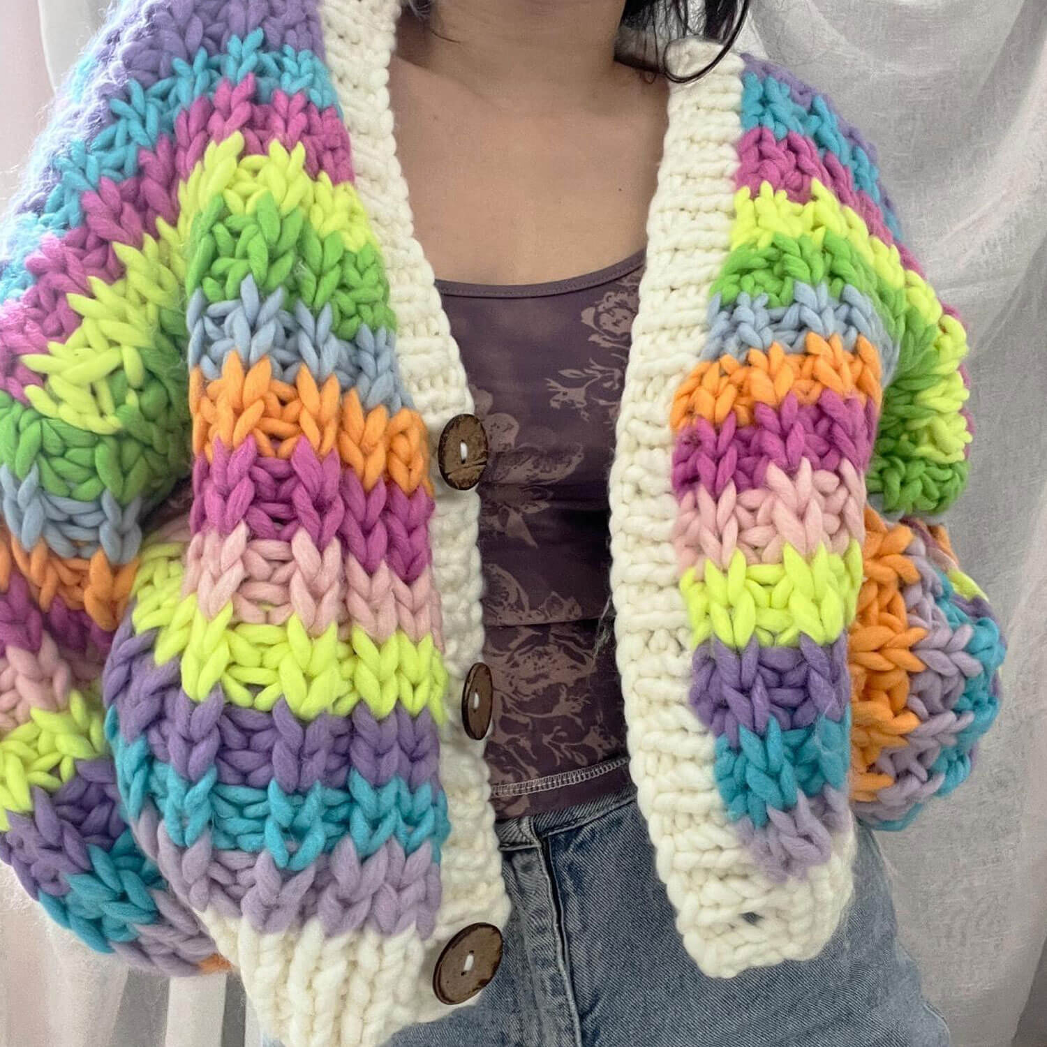 Style up your Winter with a Rainbow! Introducing our chunky rainbow striped cardigan. the epitome of vibrant chic for the season. This handmade delight is a burst of joy. boasting multi-color stripes reminiscent of a radiant rainbow. Its deep V-neck and button-up placket add flair to the crochet knit crafted from chunky yarn. ensuring maximum coziness. With its relaxed fit. long sleeves featuring drop shoulders and cuffs. this warm knit is a snug and stylish winter essential. Weighing 3.35 lbs. it's not just a garment; it's a wearable hug designed to brighten every cold day.