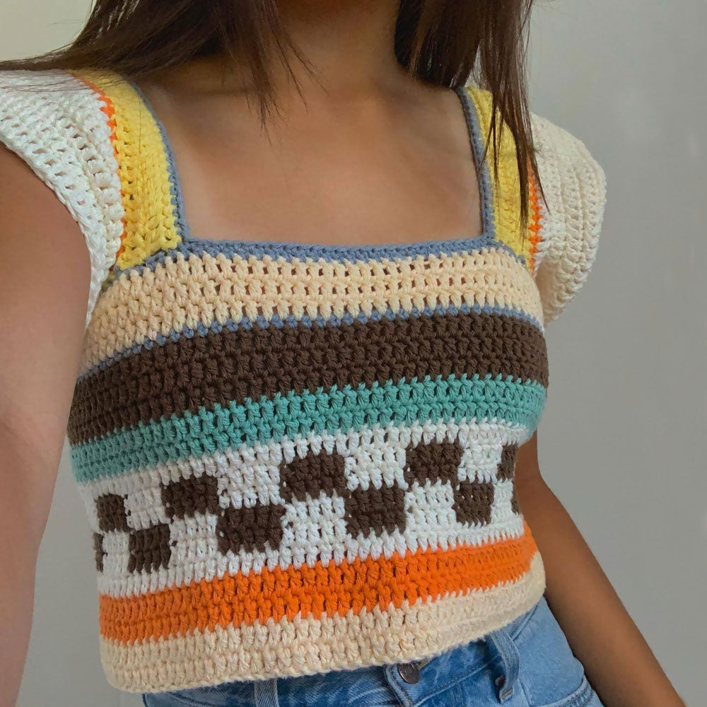 Here rainbow striped pattern has found its way to beach apparel. This colorful knit top is loosely knitted with a crocheted look from a blend of polyester and acrylic. The cute cap sleeve sits right upon your shoulder to create a square neckline for a bit of vintage flair. The beautiful striped knitwear is tailored into a sheath silhouette with a flirty cropped finish making it an endlessly versatile piece. Style it with denim shorts for your next vacation to somewhere nice and warm.