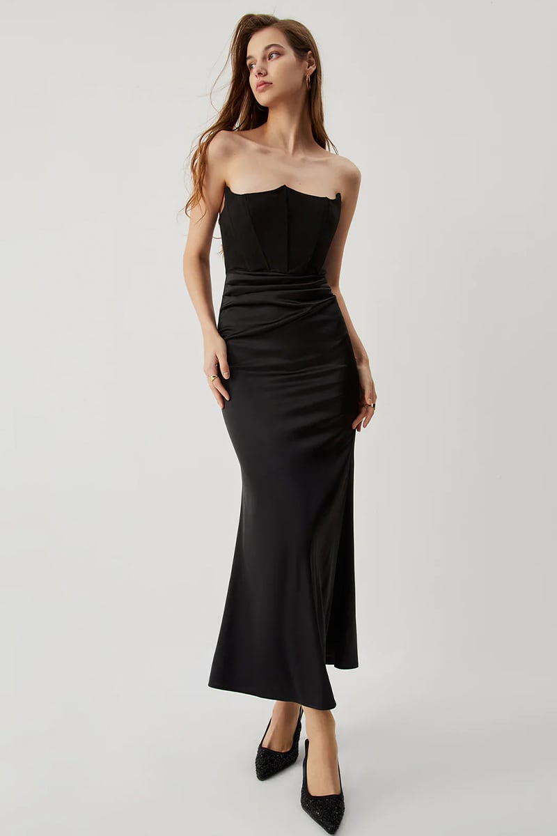 We are obsessed with the idea of dancing the night of the way in glamorous fashion with the Reeta Black Strapless Corset Maxi Dress! Take everyone's breath away with this sensational dress that features a stretchy velvet construction that shapes a sultry sweetheart neckline and a strapless. corset-inspired bodice with hidden no-slip strips. A fitted waist tops a figure-skimming skirt that is cut from luxe satin and boasts a mermaid-style silhouette as it falls to a flattering puddle length. Hidden back zipper/clasp.