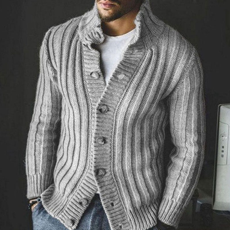 Attention. gentlemen seeking a blend of street-style chic and classic cool - behold our knit jacket designed to elevate your wardrobe through autumn. winter. and early spring. Crafted from a high-quality material. this substantial yet comfortable cardigan features a mock neck. a buttoned placket. and fine ribbing details on the neck. cuffs. placket. and hem. exuding a refined. solid color design with chunky ribbing patterns. Pair this statement piece effortlessly with your favorite jeans for a casually sophisticated look or layer it over tailored shirts for an infusion of suave street style.
