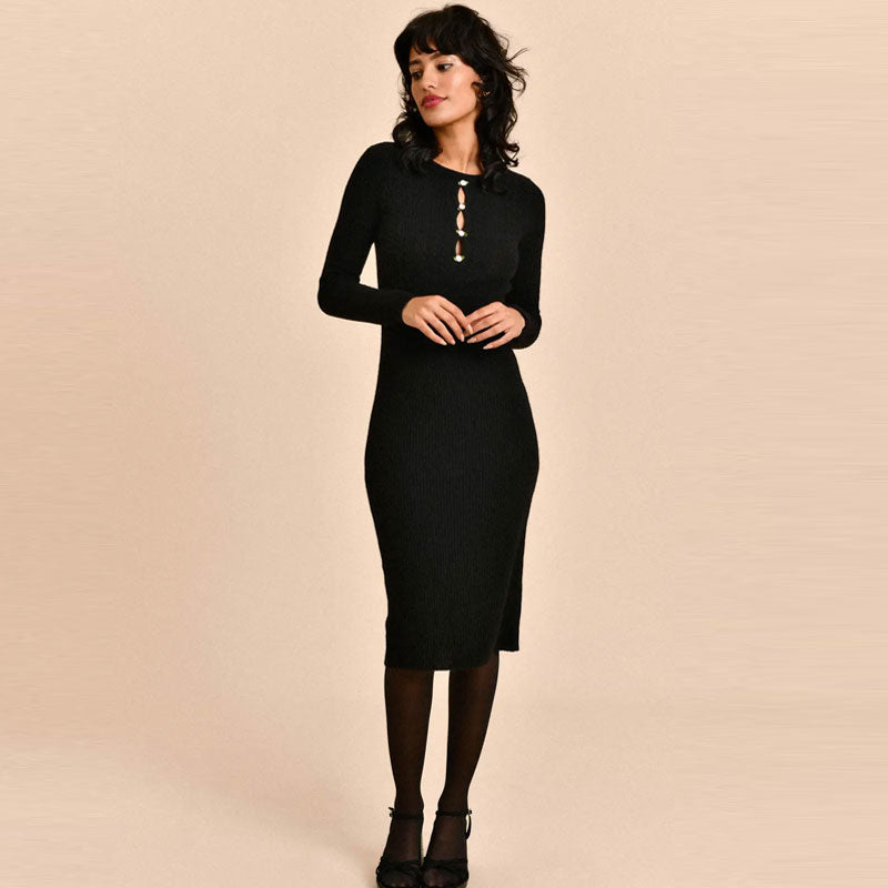 Ultra-soft and sensual. this is a perfect little black dress for women to wear from working hours to weekends. Distinguished with its mix of cable and ribbed knits. the feminine midi dress boasts a round neckline in a slip-on styling. chest cut-outs with petite rose accents. fitted long sleeves and a demure. elegant midi length cut. The cozy wool-blend knit fabric is an easily chic option in winter and fall. We love its high-stretch knit to slim the silhouette. Just style it with gold-toned earrings. heels and a baguette bag for an instant Parisian chic look.