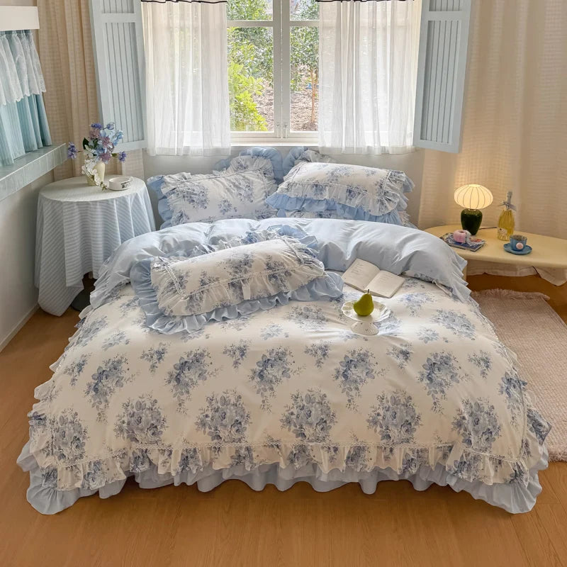 Romantic Flowers Prints Bedding Set Korean Style 100% Cotton Lace Princess Wedding Duvet Cover Bed Skirt Bedspread Pillowcases