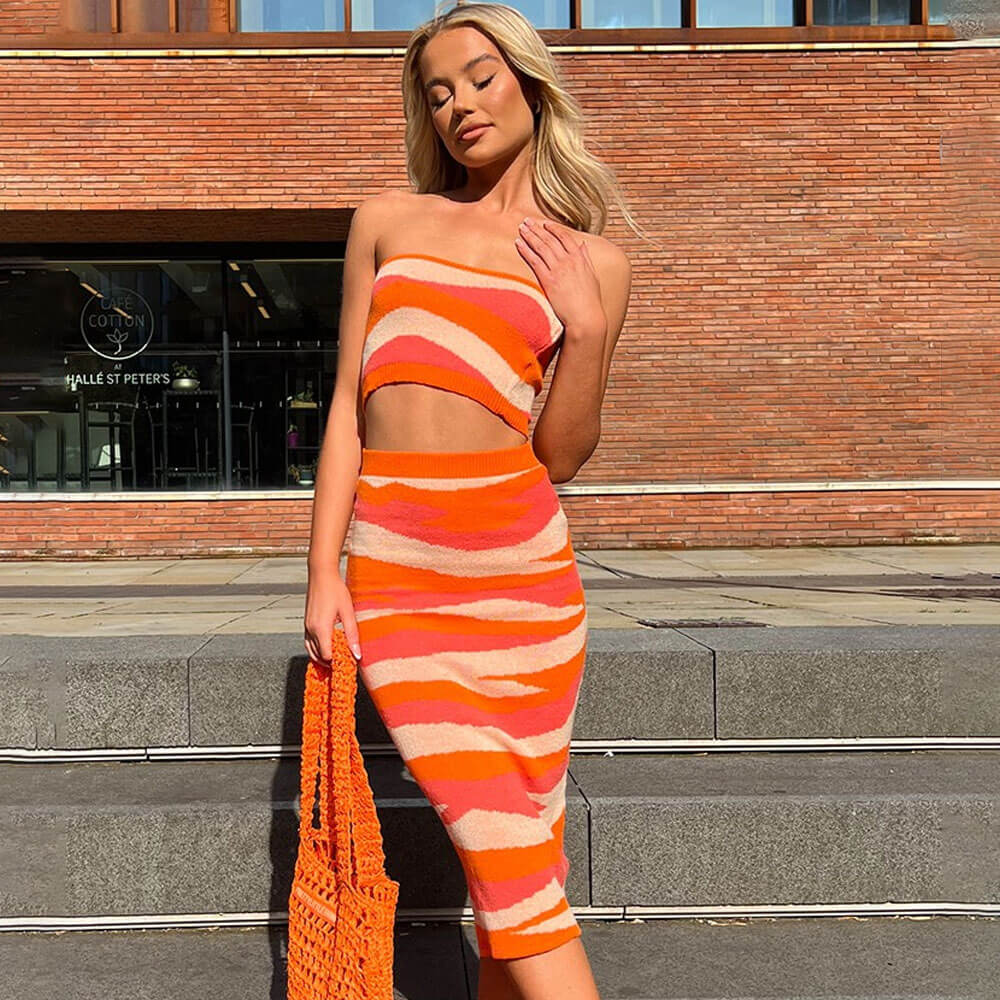 Indulge in a summer daydream with our two-piece knit set. Cut with a body-sculpting silhouette. the knit co-ord is designed in contrasting hues which gives out a unique stripe jacquard pattern making this piece a stunning attire to add to your summer wardrobe. The knit top is showcase a simple cropped style with the strapless tube design; while the matching skirt is in a high-rise sheath cut that falls to a midi length. The comfy knit texture guarantees an excellent stretch offering you the perfect body-contouring fit. Keep the look modern in style by pairing with tonal chunky shoes and a matching hand bag. Maximum beach vacation vibe!