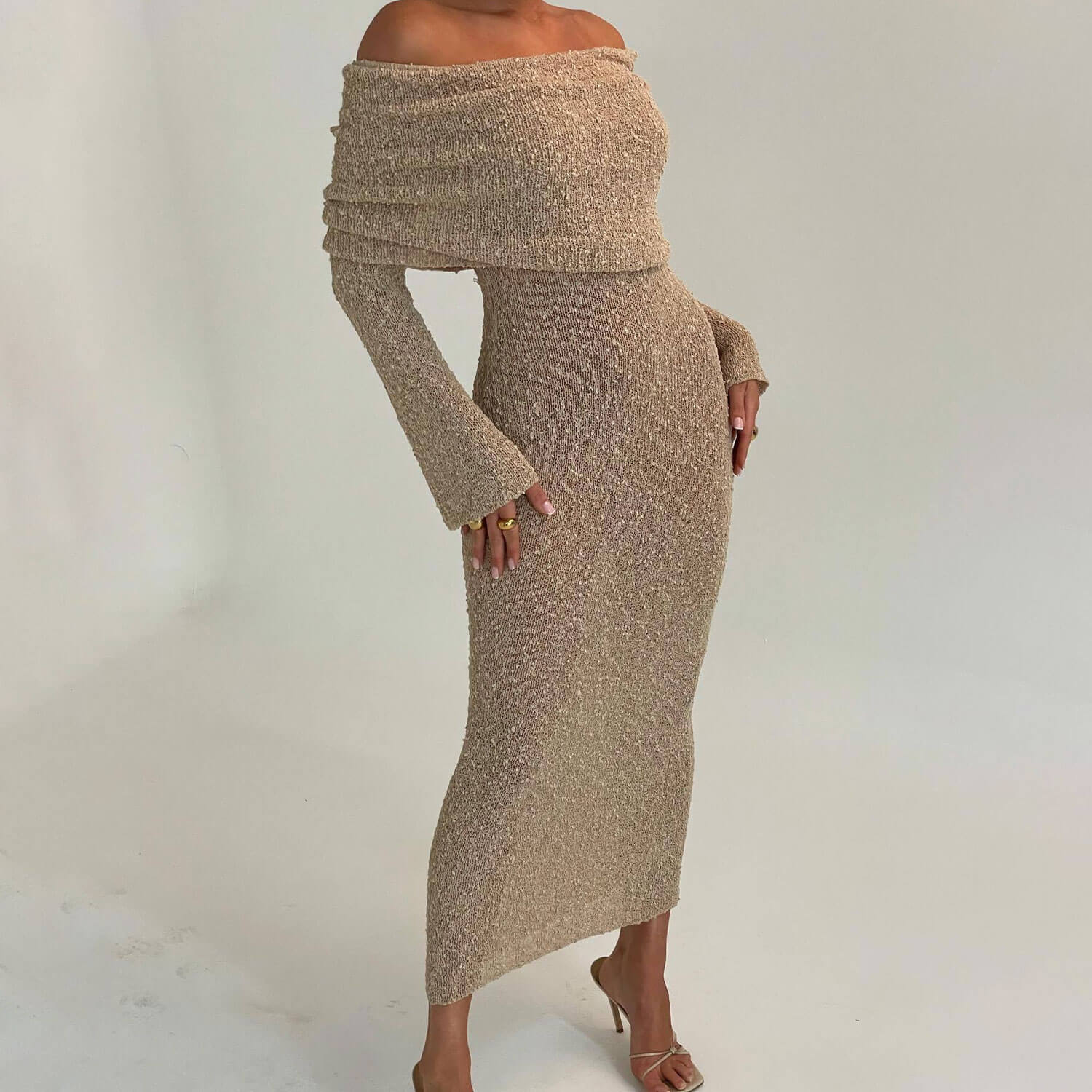 This effortless semi sheer bouclé maxi dress in lightweight popcorn yarns and stretchy. relaxed silhouettes provides a one-and-done summer outfit solution for vacation days spent sightseeing. shopping. or dining al fresco. Boasting a strapless neckline and flared long sleeves. this breathable off-the-shoulder maxi knitted dress is perfect for showing off those sun-kissed shoulders. Moreover. wearing it with a sexy bikini set and flats as a versatile beach cover-up dress is also a good choice for casual resort wear. Available in three neutral colors for infinite outfit possibilities.