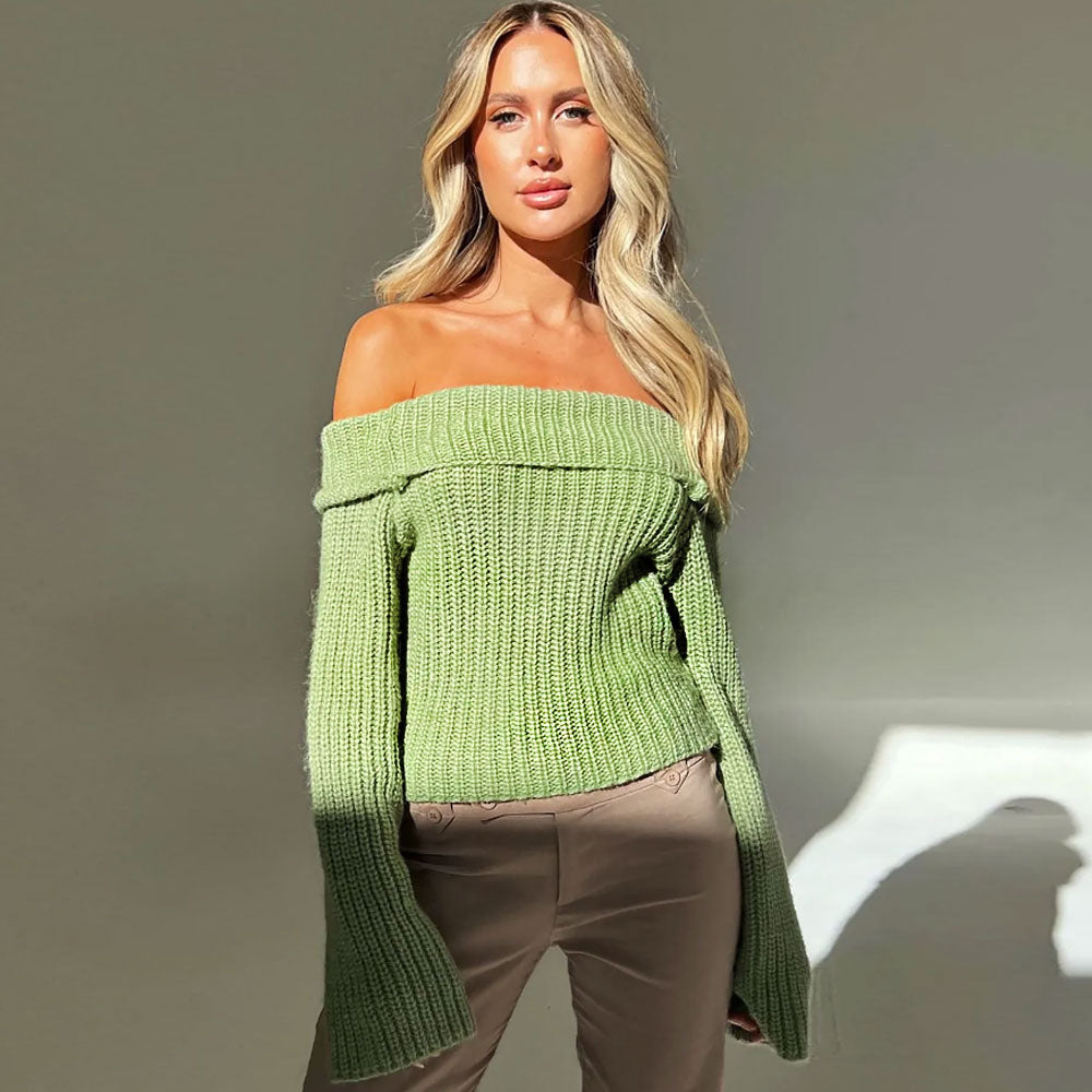 This pullover is just the piece that you need to carry yourself through the winter but still in style. Made with medium-weight acrylic construction in a brioche-knit texture. the jumper offers a stylish and sophisticated take on novelty with the fold-over Bardot neckline that elegantly flaunts your collarbones without the bulk. To be cropped for a perfect proportion. the versatile piece can be worn with high-waist jeans or skirts. depending on the vibe.