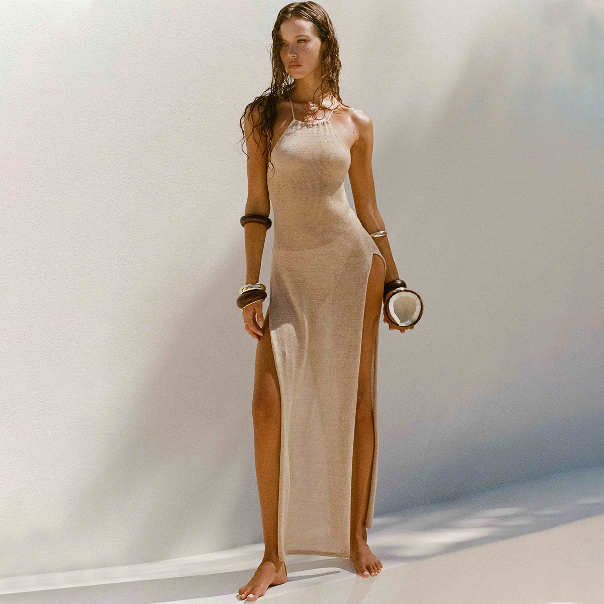If the alluring open back detail of this knit dress with glitter silver lurex threads doesn't convince you of crochet's allure. nothing will. With its high neckline. lace-up tied back. and figure-hugging silhouette. this sexy knit sheer dress is a stunning choice. Semi-sheer knitting. side thigh splits. and a long hemline add to its allure. Slip into it and radiate goddess vibes in every photo. For those seeking versatile investments that last beyond the vacation. look no further. This sexy swimsuit cover-up doubles as a must-have vacation dress for summers to come.