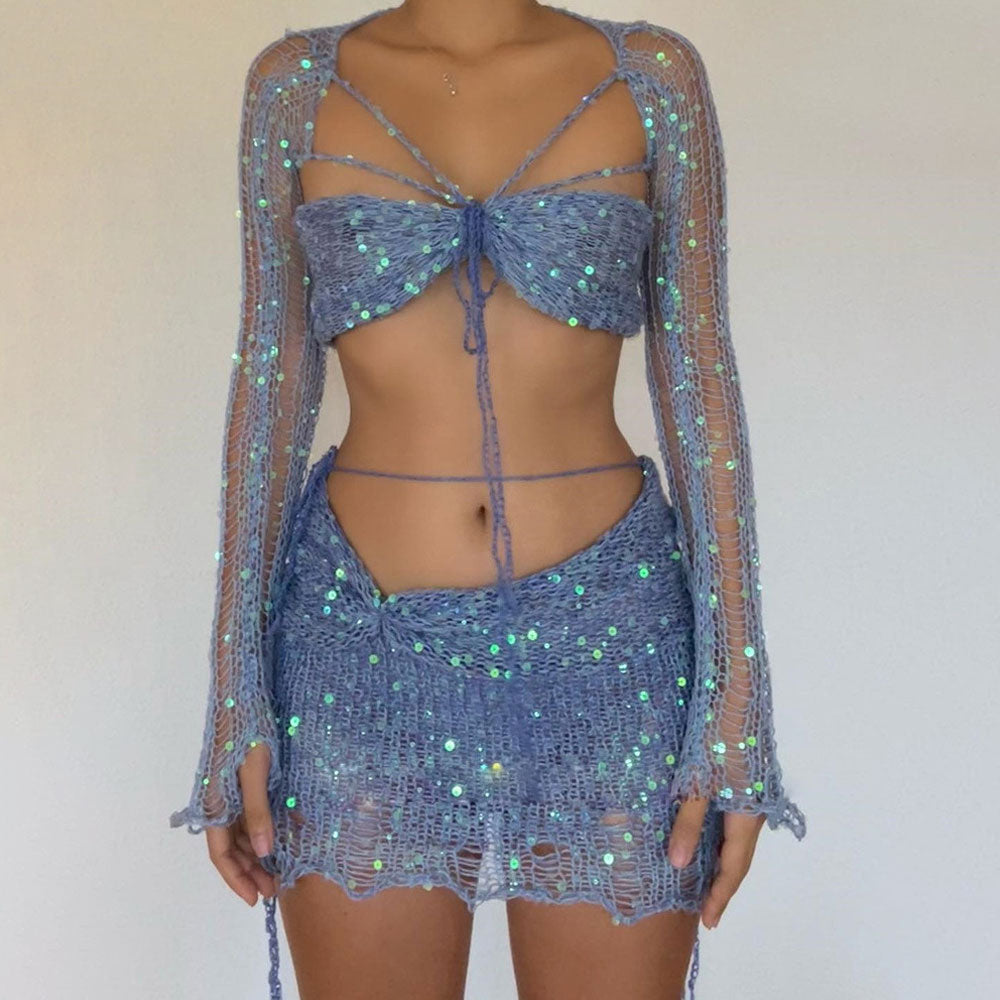 Fall in love with the most desirable crochet knit set that blends high-femme and boho chic! This sparkly distressed knitwear ensemble is trimmed with dazzling sequins all over. creating a semi-sheer laddered knit three-piece. The crop shrug features wide-cuffed long sleeves and front strings tied at the darling sweetheart neck cropped bra top. Paired with its roll-trim low-waist bodycon mini knit skirt. complete with a drawstring waist tie for a distinctly free-spirited summer look.