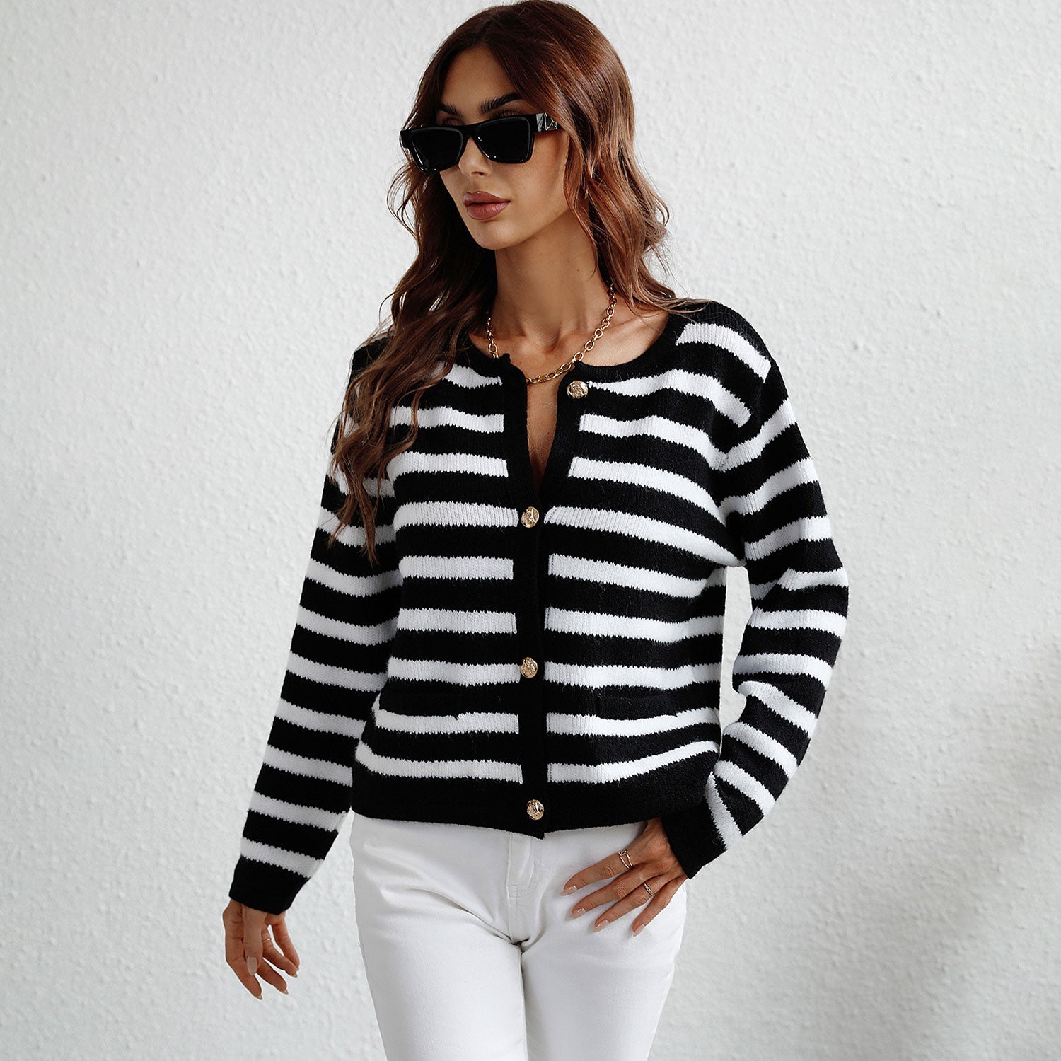 Meet the elevated cardigan - our stripe cardigan. the epitome of effortless chic and versatile fashion. This sophisticated knitwear boasts a simple round neck and golden tone buttoned placket. adding a touch of elegance. Adorned with long sleeves and a contrast color striped pattern. including practical patch pockets. it harmonizes practicality with trendiness. Crafted from a blend of acrylic. polyamide and polyester. it ensures both comfort and style. This bicolor knit jacket stands as a wardrobe essential. effortlessly complementing any ensemble for an elevated. easy-to-wear statement.