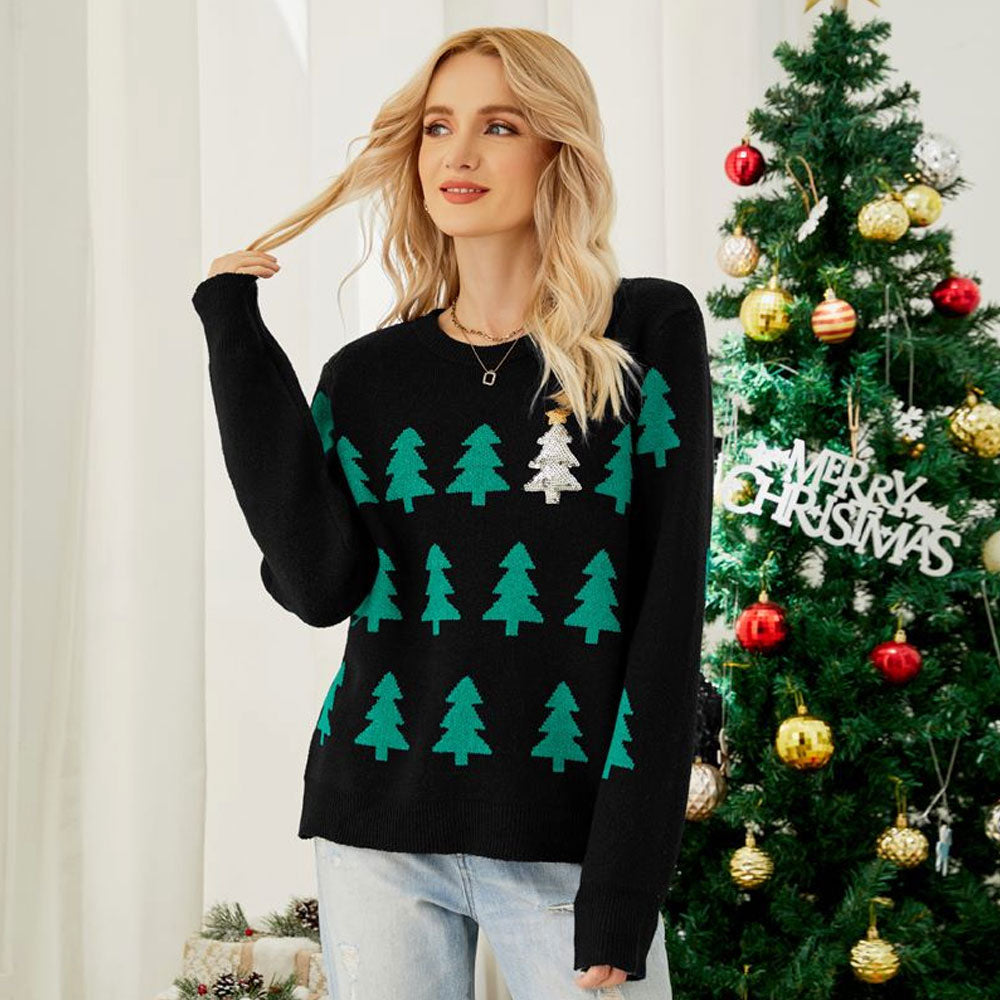 Our Christmas tree sweater is a joyous take on the classic crew neck and ribbed edges. with an all-over Christmas tree pattern for a Christmas-y feeling. Traditional with a twist. this holiday sweater also has a shimmering sequin tree with a shiny star for a playful accent. Our take is in a loose fit and a timeless style with softness and durability as it employs a blend of polyester. acrylic and nylon to carry you through the wonderful moment for family gathering.