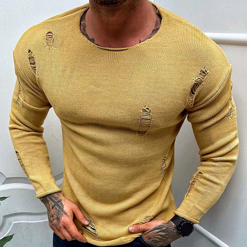 Offering you a ragged look in a unique nonchalance. this men's sweater is cut in a thin lightweight construction from breathable viscose knit fabric. The stylish ripped details and rolled hemline add an instant rebellious feel to upgrade your autumn fashion. The slim cut features a classic round neckline and long sleeves. making this piece easy to wear and super appropriate for the transitional seasons. Continue the cool men street look by styling it with pants and sneakers. Plus. yellow color is sure to make you stand out from those black cliche and add fall vibes to the look.