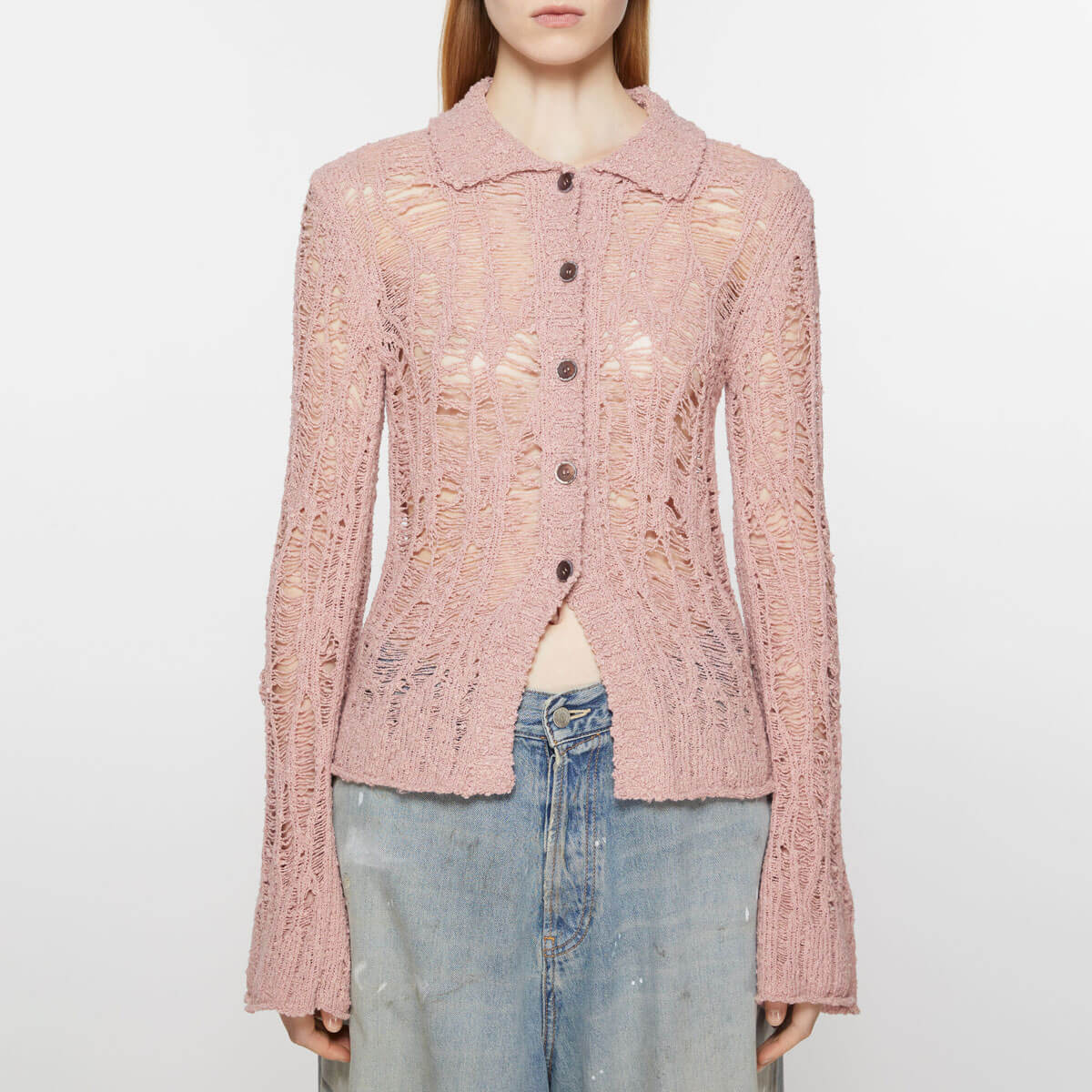 This breezy dusty pink ripped cardigan. crafted from a cotton blend. features a slim open-stitch design that gives it a chic. distressed look. From Foxsweaters. this breathable. semi-sheer knitwear fastens with a row of buttons that stop before the split hem. making it an ideal match for your high-rise bottoms. This girly knit top fits seamlessly into the light pink dressing trend and boasts a spread collar. flared long sleeves with ribbed knit cuffs. Layer it over a bralette or camisole for added coverage. or wear it as a stylish long-sleeve knitwear option.