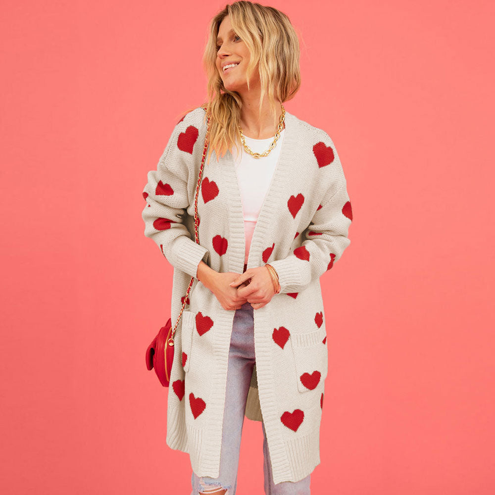 A cute knit jacket that speaks volumes! Our sweetheart cardigan is the epitome of charm. boasting adorable love patterns in contrasting colors. With its long length and an open front placket featuring chunky ribbed knit edges. it's as cozy as it is stylish. Complete with delightful patch pockets and long sleeves featuring cuffs. it's a versatile piece perfect for daily wear. Available in Red. Pink. Beige. and Black. this knitted cardigan. made from a blend of acrylic and polyester. adds a touch of cuteness and warmth to your winter wardrobe.