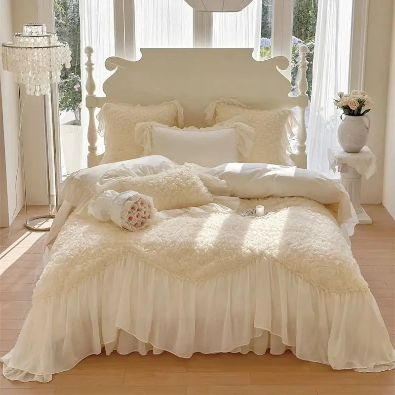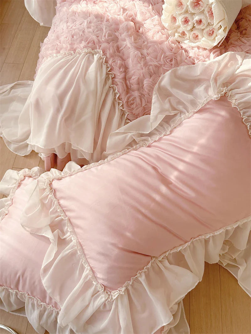 Three-Dimensional Rose Flowers Lace Ruffles Patchwork Bedding Set. Duvet Cover. Bed Sheet. Pillowcases. Pink. Egyptian Cotton
