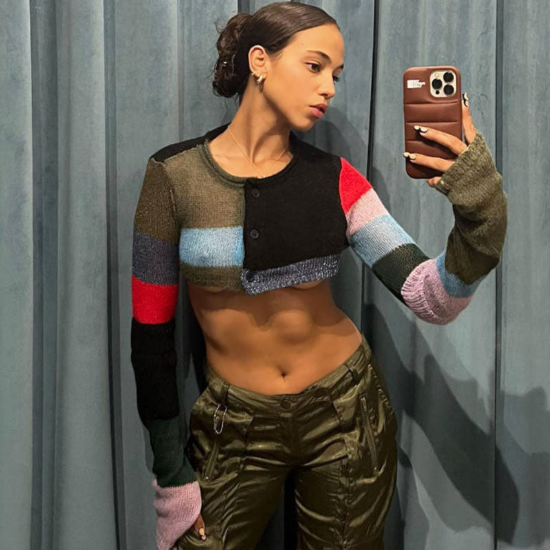 It's super cute and would have every inch looked the trendy early-aught style as you step out in this short cardigan. Inspired by the bolero style. the crew-neck cardigan is featured with a very short cutting and color-blocking construction will add an interesting update to your outfit. The lightweight fabric is made into a shrunken cardigan with a buttoned placket to the front. Put your street style-eaque on display in this super short cardigan and add a fitted top plus cargo pants for a model off-duty look.