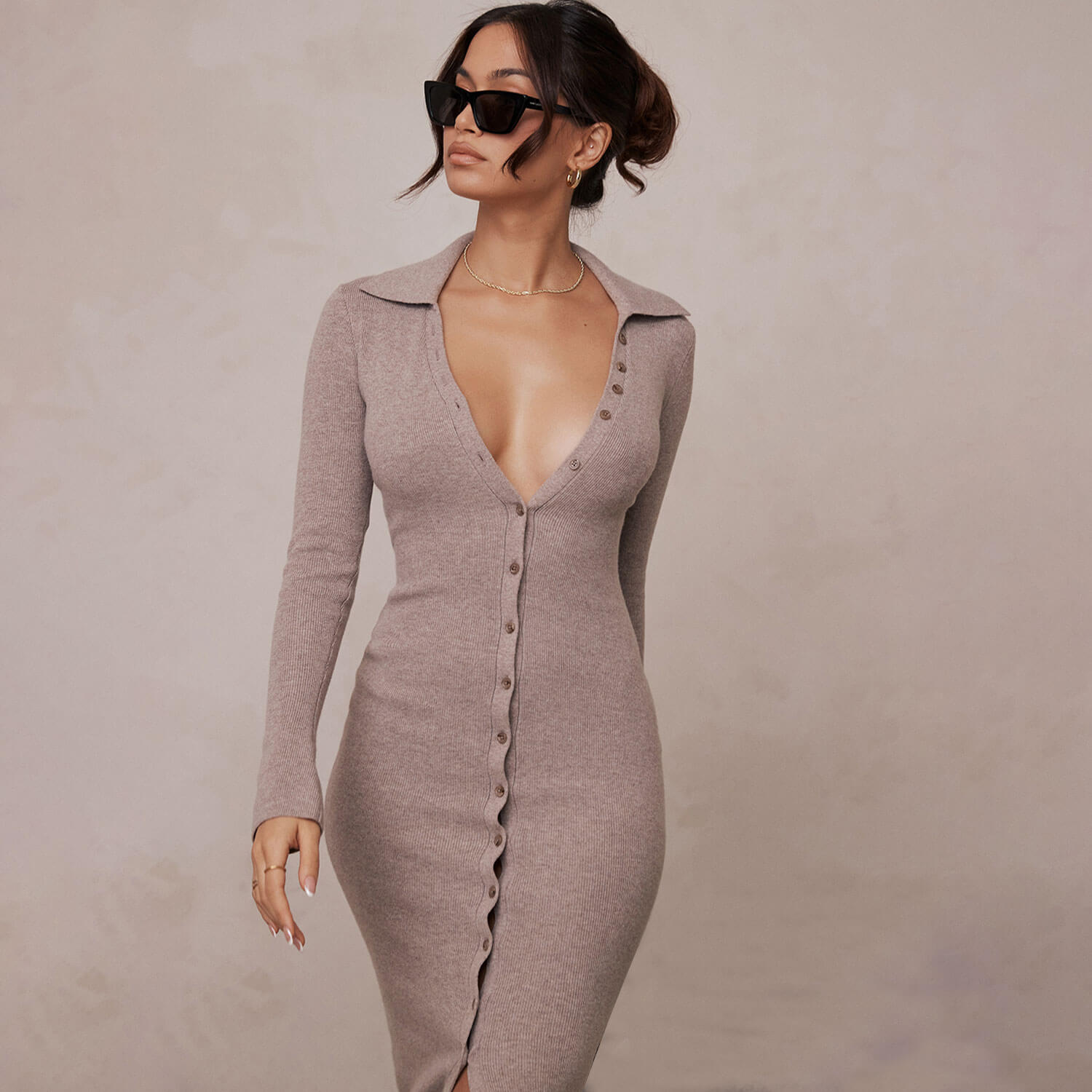 Put a spin on traditional elegance with our versatile knitted midi dress. designed to redefine your style options. This captivating piece can be worn alone to showcase its allure or transformed into a chic cardigan for a unique twist. Crafted from a slinky and stretchy ribbed knit. this two-way sweater dress features a slim-fitting silhouette that flares out below the front buttons. creating a dynamic contrast. The addition of a spread collar elevates its sophistication. Long sleeves provide both style and warmth. while the bodycon fit embraces your curves with flair. The midi-length hem exudes timeless charm. making it a elegant choice for various occasions.