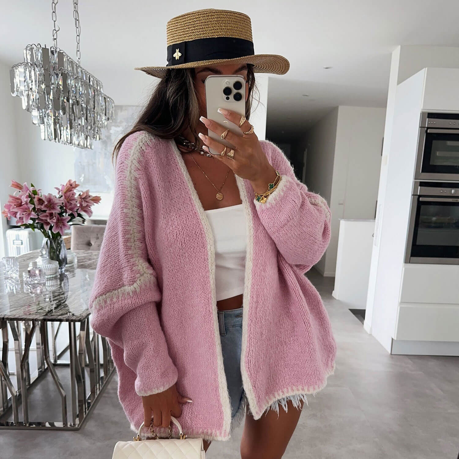 Inspired by timeless comfort and effortless style. this contrast trim cardigan comes in a delightful palette of colors: pink. black. hot pink. baby blue. apricot. khaki. moss green. and beige. The relaxed silhouette and cozy knit are enhanced with bicolor stitching along the shoulders. neckline. and hem. adding a touch of sophistication to its laid-back design. Perfect for layering. this midweight 1.5 lbs knit jacket effortlessly blends warmth and style. making it an essential piece for autumn and winter.