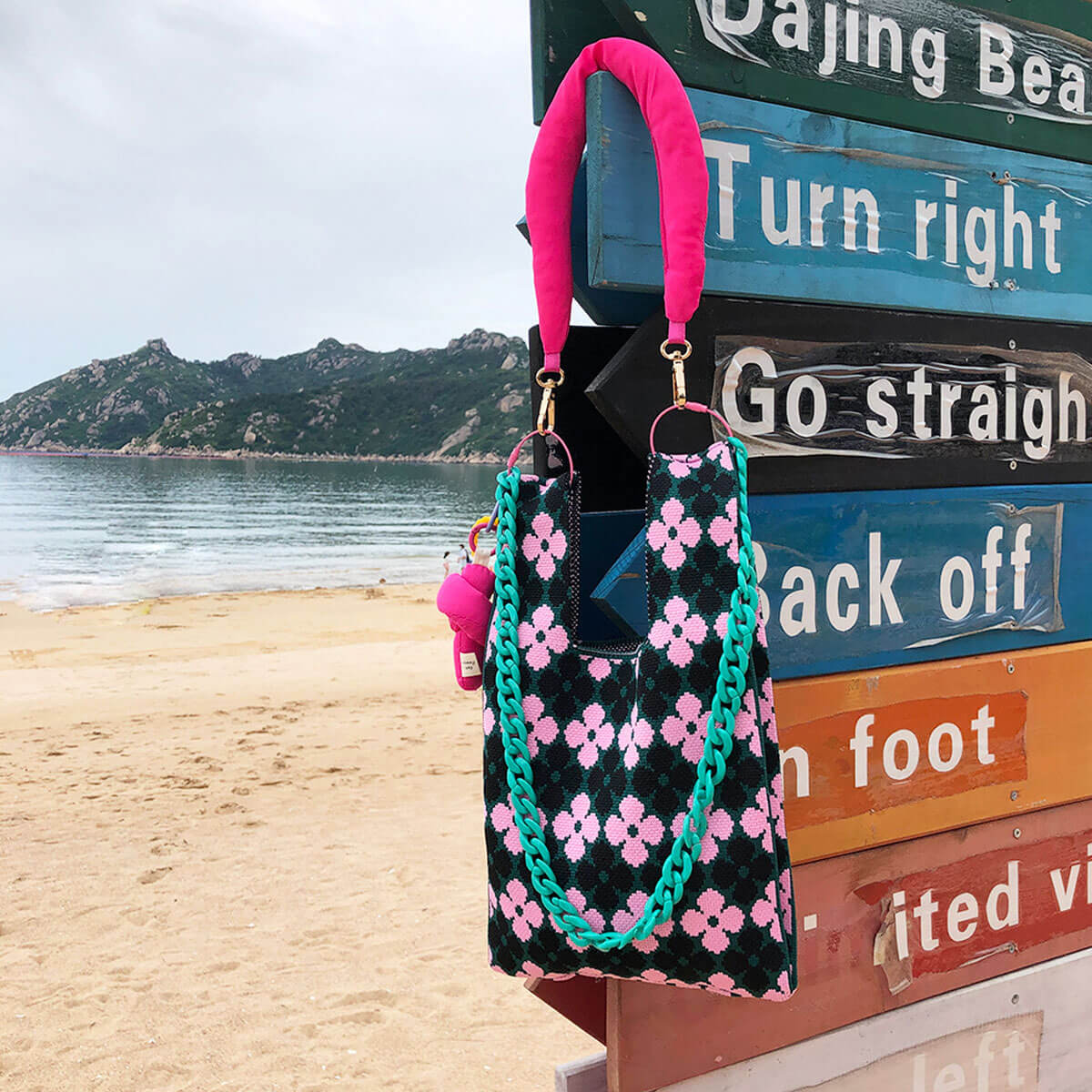 This is not your basic beach knit tote. Crafted exclusively from blended yarn. this knitted handbag features a Four Leaf Clover-intarsia pattern in varying shades. Designed in a boho chic mini size with an open top. it boasts ample room for your essentials. The suspender top handles allow for easy wrist-slinging or hand-carrying. Optional chunky chain link and hot pink cloudy shoulder handle add flair. Its bold colors make it the perfect companion for casual outings. especially for resorts. beaches. or loungewear for laid-back leisure.