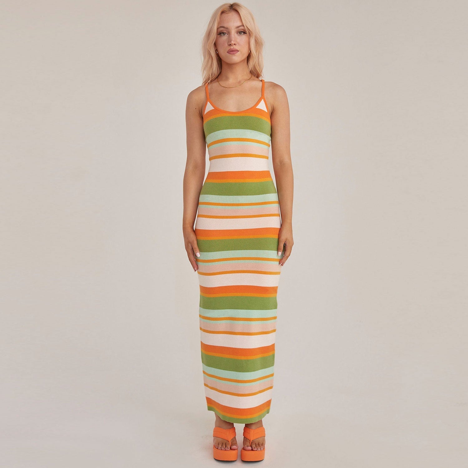 Saturated in multicolored rainbow striped knit. the slip dress is crafted with acrylic yarns to offer you a comfy soft touch. The scoop neckline. adjustable suspenders straps and open back design give this maxi knit a summer appropriate look which is perfect for those sun-drenched vacations spending on the beach. The long ankle-grazing length adds another sense of chic laid-back vibe. A pair of chunky shoes will make you instantly put-together. Easy to wear and easy to style.