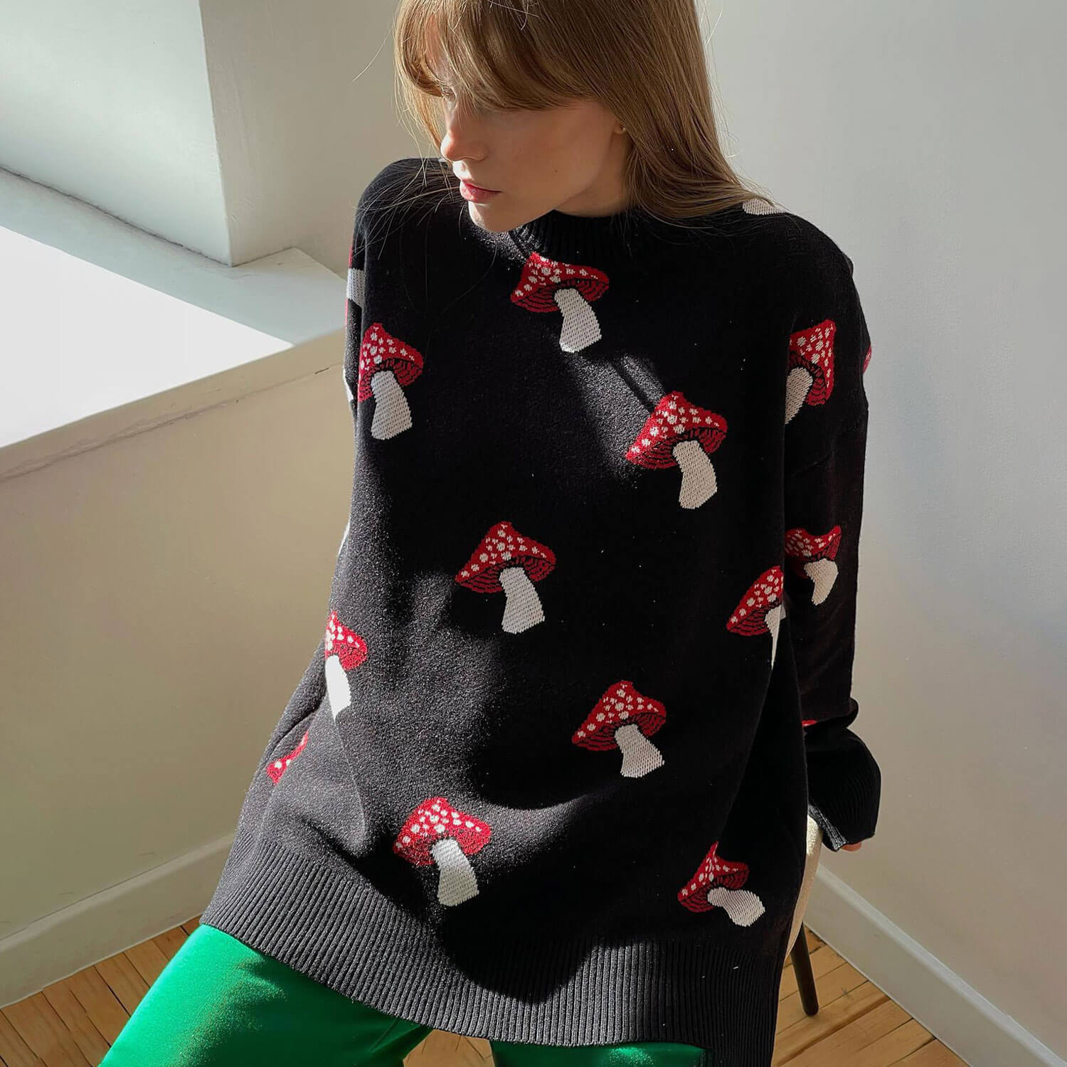 Revive retro vibes with this cute mushroom sweater! Its wide round neck. a relaxed-fit silhouette and long sleeves with drop shoulders provide plenty of comfort. while the intarsia pattern harkens back to style of bygone eras. An elongated hemline uplifts the silhouette. making the knit jumper a versatile choice that's great for a day out or a cozy night in. Look fab and feel warm with this uniquely fashionable knitwear - a hallmark of timeless style in your wardrobe!