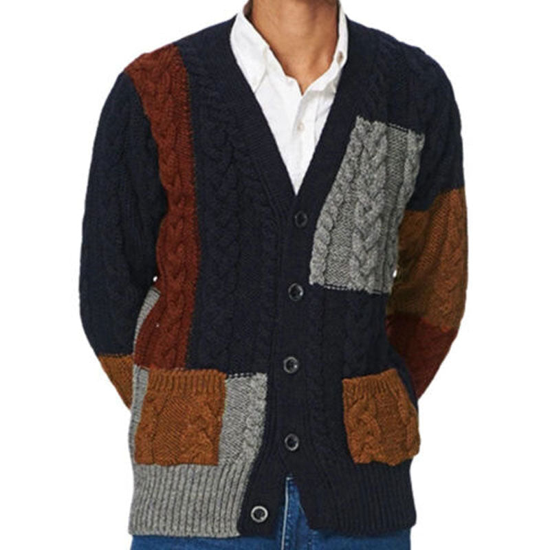 Cable knit jackets offer boundless options for men during autumn and winter. particularly with this captivating patchwork design. Our retro-inspired cable knit cardigan combines classic charm with a modern twist. Featuring a V-neck. button-up placket. and thoughtful pockets. this substantial yet comfortable cardigan boasts color panel patchwork design. Crafted from premium materials around 1.87 lbs. it's tailored for the colder seasons. offering warmth and style effortlessly. Perfect for layering over shirts or tees. this statement piece complements both casual and semi-formal attire.