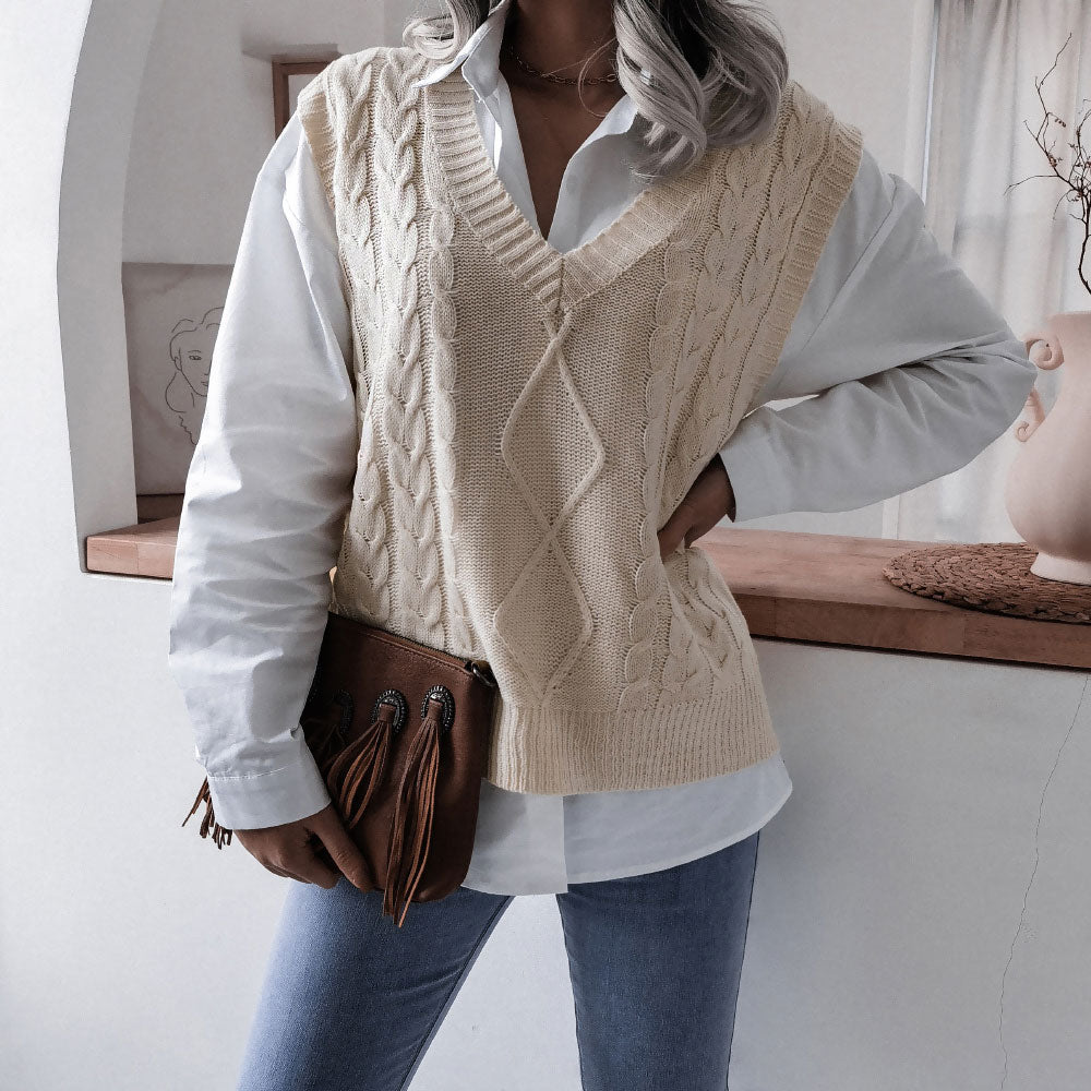 Meet the coastal-grandma aesthetic this winter with our sweater vest! Inspired by the Aran style. it's constructed with the fisherman's knit. which is distinguished by the complex textured stitches and cable patterns. Giving a soft and comfortable touch. the V-neck sweater vest is made from a blend of acrylic and polyester and is cut in a relaxed. regular fit to flatter most of the body types. It's done with ribbed finish along the neck. armhole and hem for a fitted look. A versatile insulation layer. the pullover vest can be worn between a leather jacket and a button-up. making it a classic layering combo to keep you warm in style.