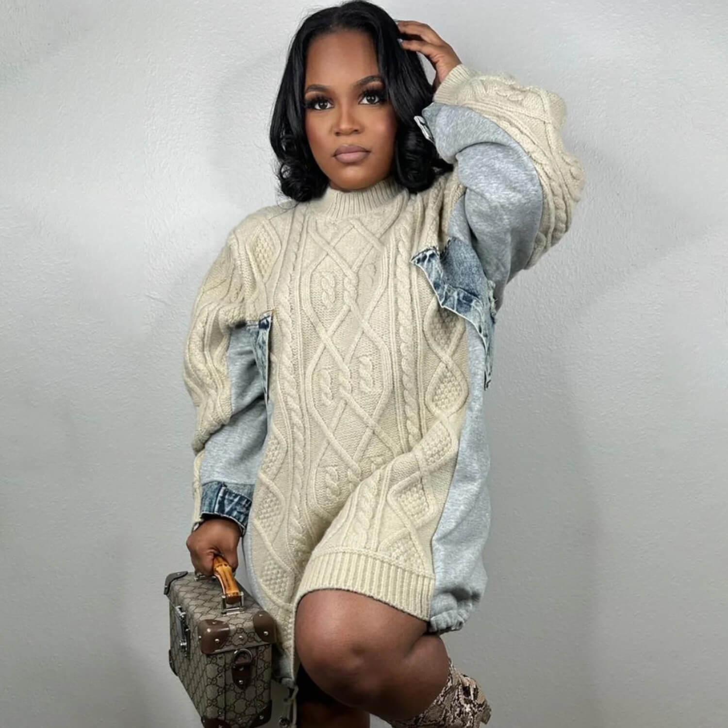The drawstrings at the hemline allow you to easily switch up the silhouette. giving a versatile look to this weekend-ready hoodie-cut sweater. It's crafted from a mix of cotton. denim. and knit. with intricate ribbed knitting and cable patterns adding texture. This paneled fisherman pullover features a high round neck. a drop-shoulder design. and long sleeves. ensuring a relaxed and comfortable fit. Perfect for a vintage vibe. street style. and casual outings during the fall and winter seasons.